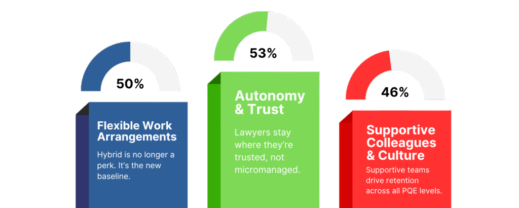 Lawyers are seven times more likely to enjoy their work because of autonomy than because of bonuses. Compensation still matters, but it does not drive daily fulfilment. The real loyalty drivers are trust, flexibility, and supportive culture.